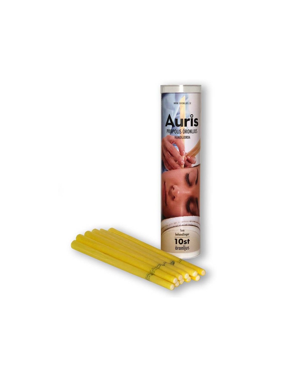 Slappna av med öronjus och upplev en befriande känsla. Lågans rörelser medför luftvibrationer i ljuset com tillsammans med ett lätt undertryck skapar mjuk massage för trumhinnan. Öronen, bihålorna och pannan känns befriande genom tryckutjämning och värme. För de allra flesta kommer känslan relativt omgående efter behandlingen och kan spontant även medföra en lättare näsandning. Våra öron är självrengörande men ibland strös systemet av att produktionen av öronvax tillsammans med hudavlagringar bildar vaxproppar. De kan bl.a. leda till beskymmer som t.ex. försämrad hörsel, pip- eller susljud, känsla av lock för öronen. Auris öronljus värmer upp örats inre väggar och vaxet mjukas upp. Den varma luften skapar ett vakuum och ett sug (skorstenseffekt). Detta hjälper till att transportera bort överflödigt vax, vätska och andra föroreningar och dessutom återställs korrekt spänning i trumhinnan. Auris öronljus innehåller propolis och förstärker örats naturliga försvar. Auris koniska öronljus är gjorda på 100% linnetyg rullade för hand med innehåll av bivax och propolis. Behandla alltid båda öronen vid varje tillfälle.